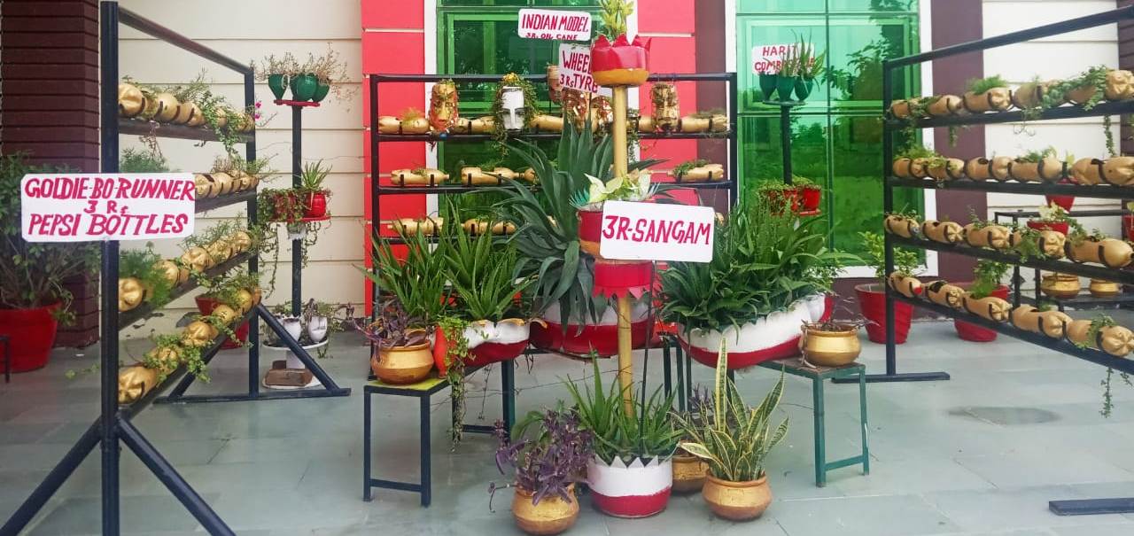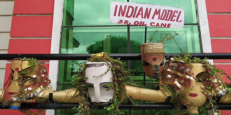 Indian model is a beautifully crafted mannequin made from oil cane giving a real illusion of human beings thereby promoting gender equality and love for plants . various different coloured plants are used as the figurative head for the oil cane Mannequin.Students take important lessons about to life cycle of colourful plants and the science behind the colour such as absence and presense of pigments etc.