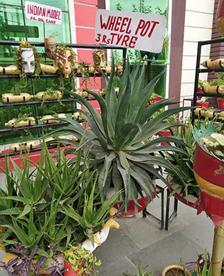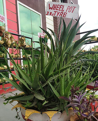 Wheel pot is a beautiful contrivance made from tyre and carved into a beautiful pot giving illusion of a desert like condition as water retention is not possible in this case ,thus plants such as cactus and aloe vera are grown and taken care of by the pupil of our school.